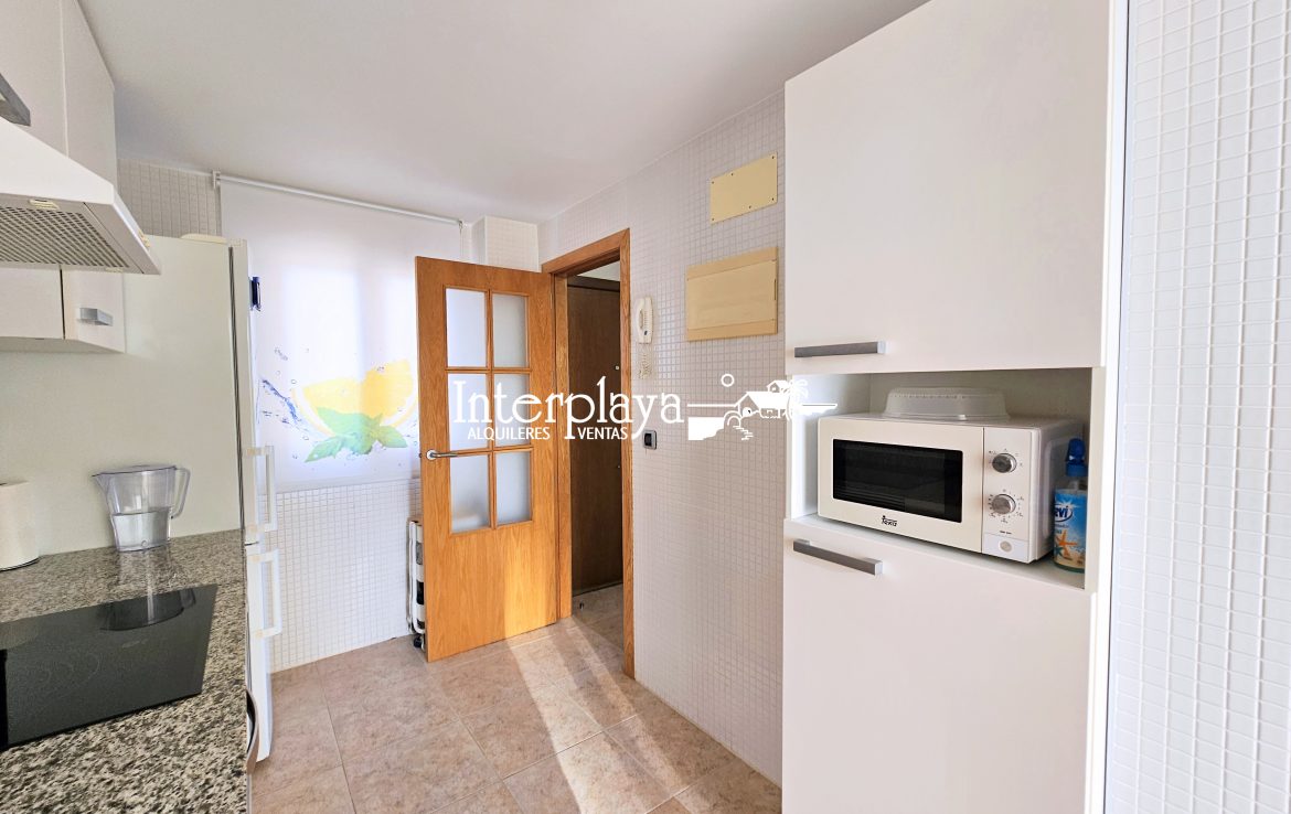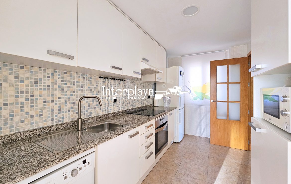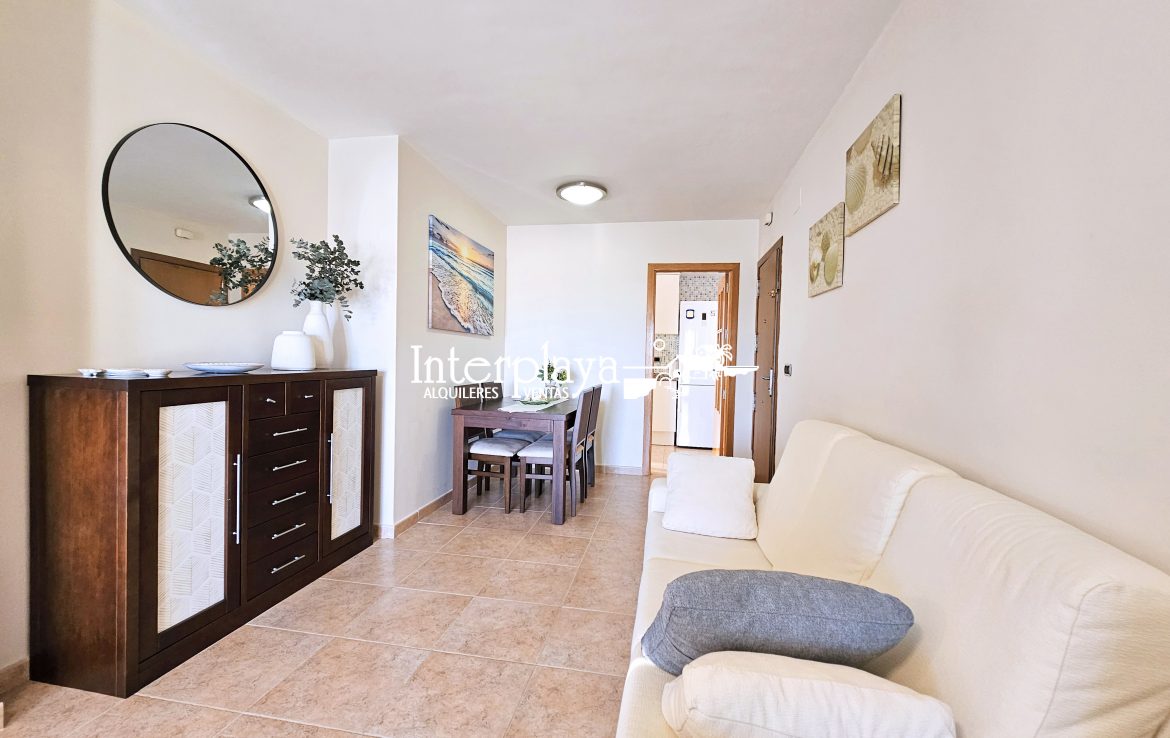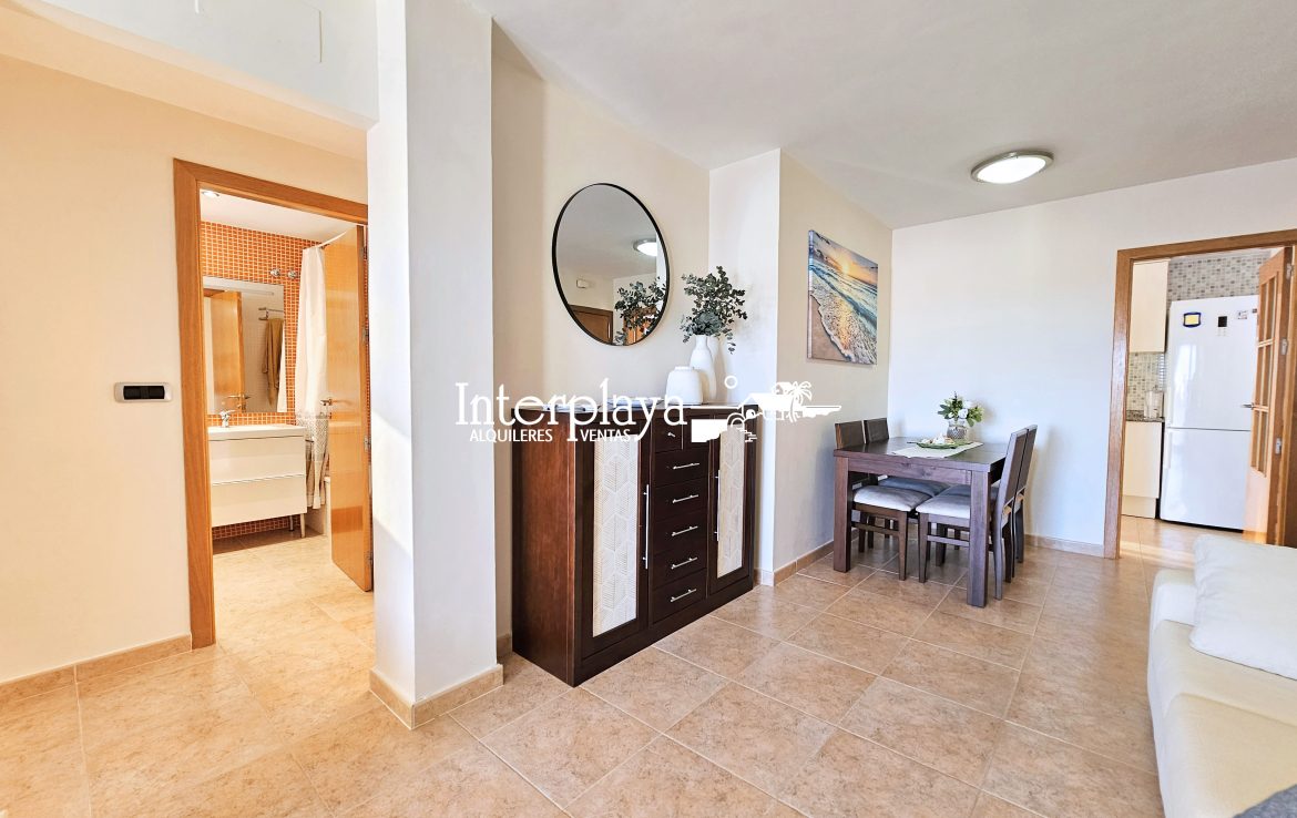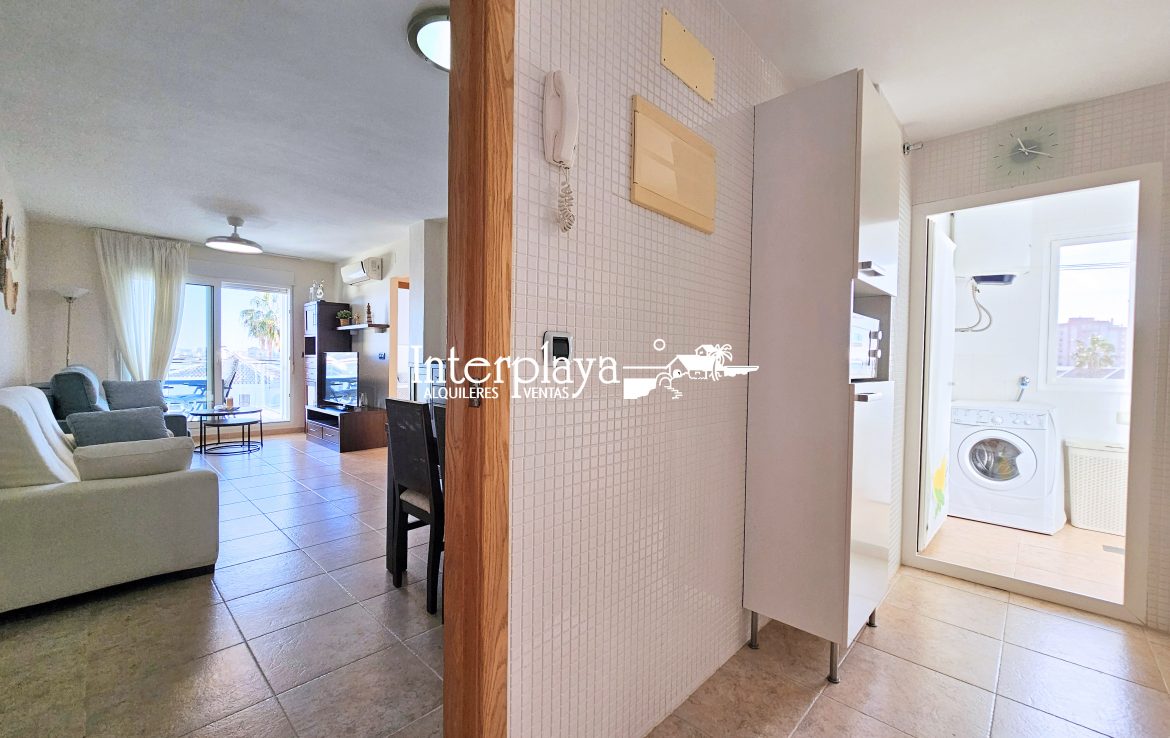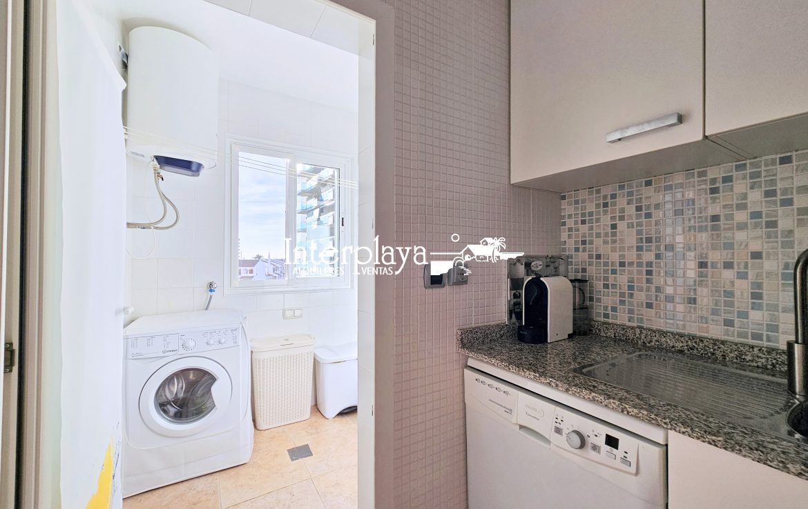 El piso cuenta con dos acogedores dormitorios, ambos equipados con armarios empotrados, y el dormitorio principal ofrece acceso directo a la terraza, perfecta para relajarse al atardecer. El salón comedor es coqueto y luminoso, también con acceso a la terraza y vistas al mar, creando un espacio ideal para disfrutar de momentos inolvidables. La cocina independiente está completamente equipada con electrodomésticos modernos y cuenta con un práctico lavadero.