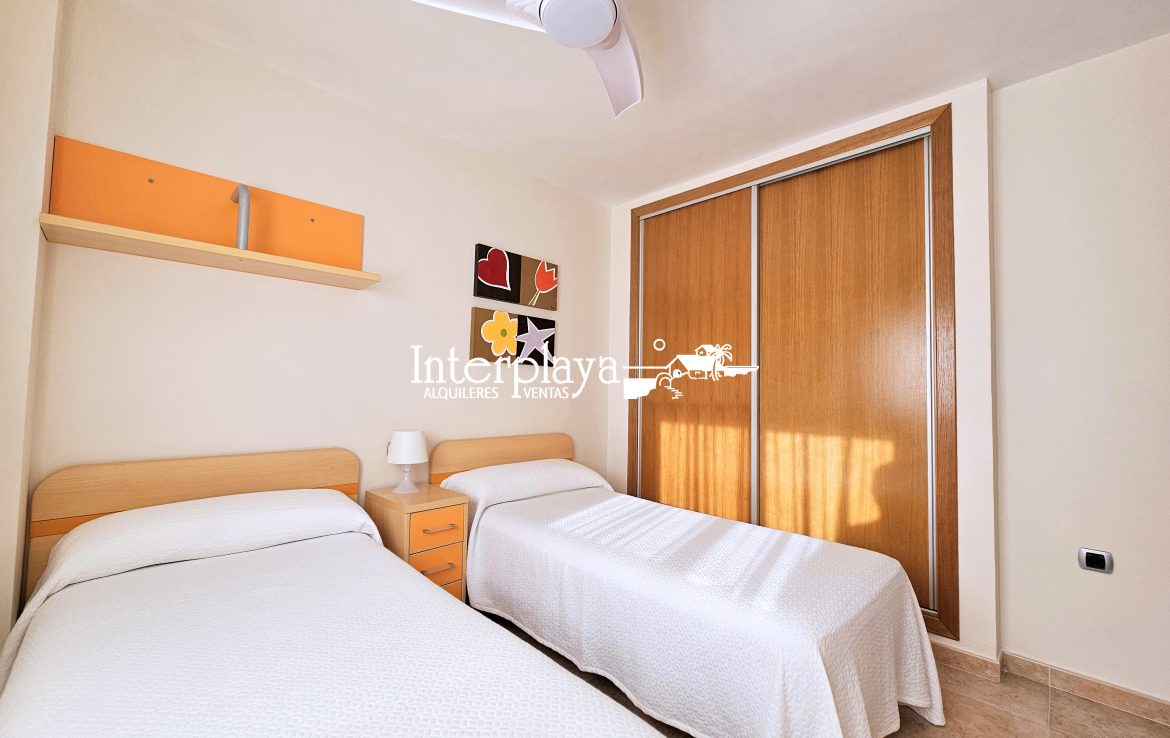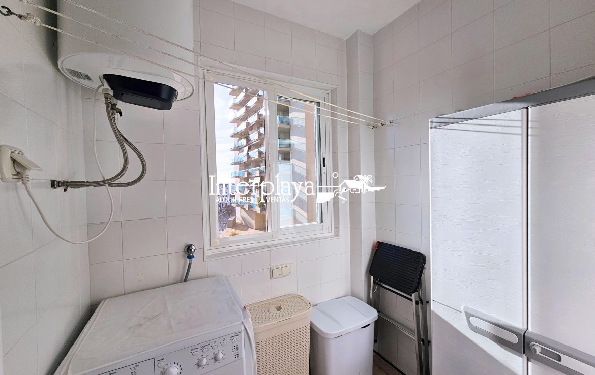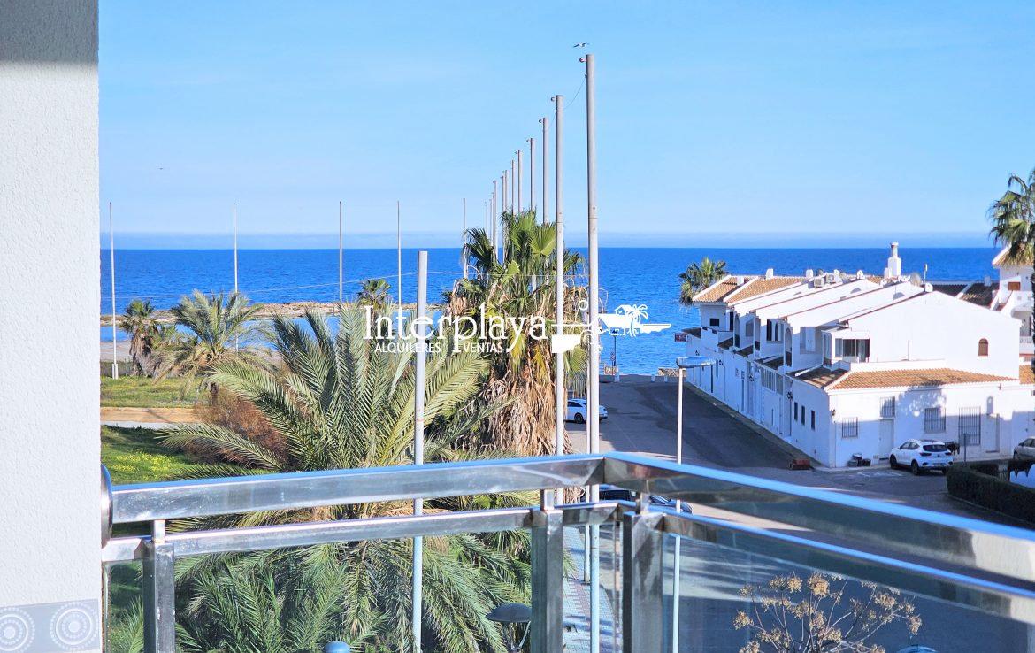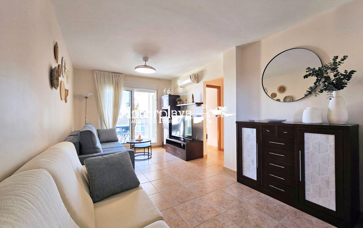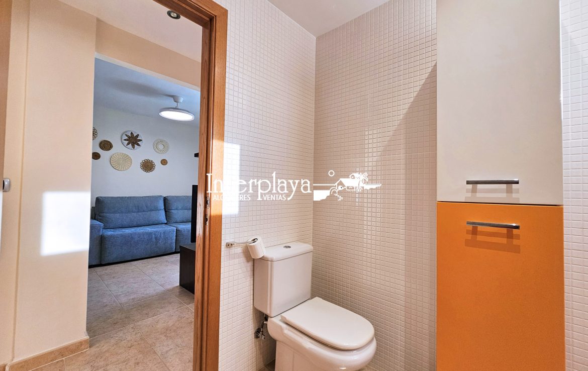El piso cuenta con dos acogedores dormitorios, ambos equipados con armarios empotrados, y el dormitorio principal ofrece acceso directo a la terraza, perfecta para relajarse al atardecer. El salón comedor es coqueto y luminoso, también con acceso a la terraza y vistas al mar, creando un espacio ideal para disfrutar de momentos inolvidables. La cocina independiente está completamente equipada con electrodomésticos modernos y cuenta con un práctico lavadero.