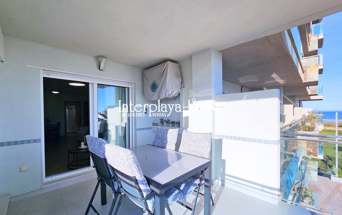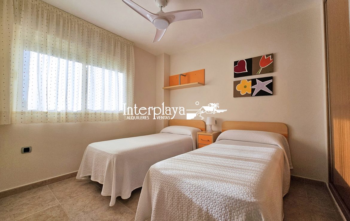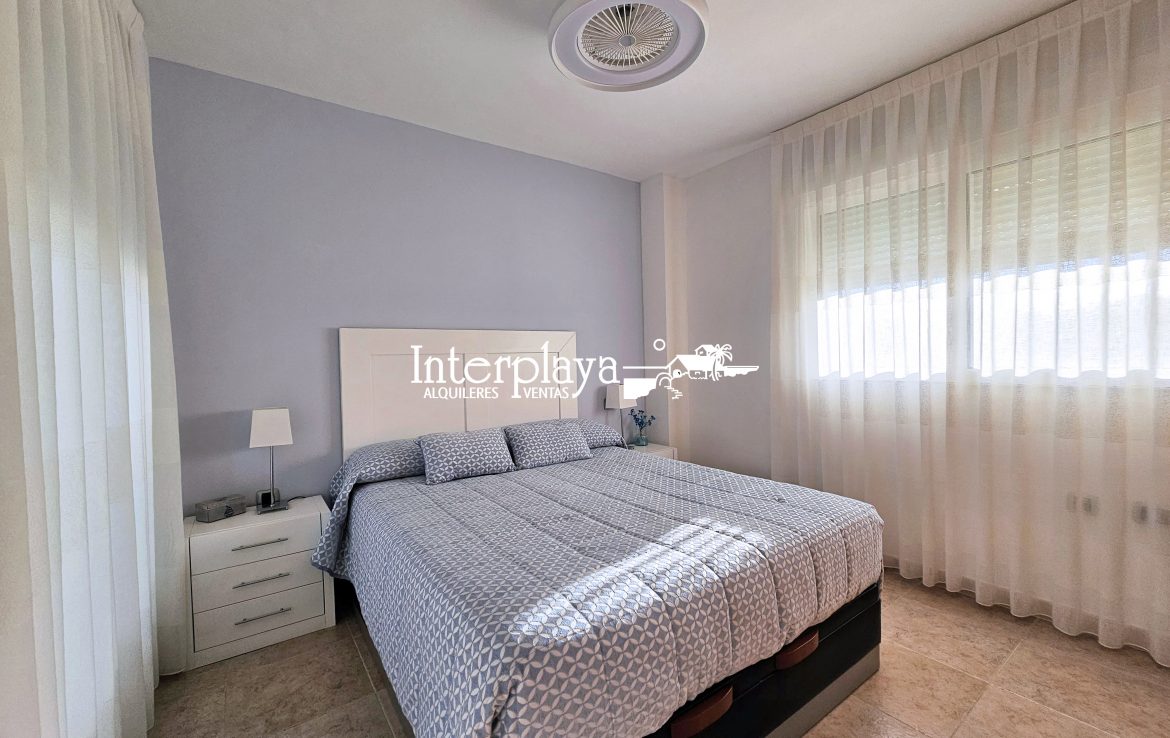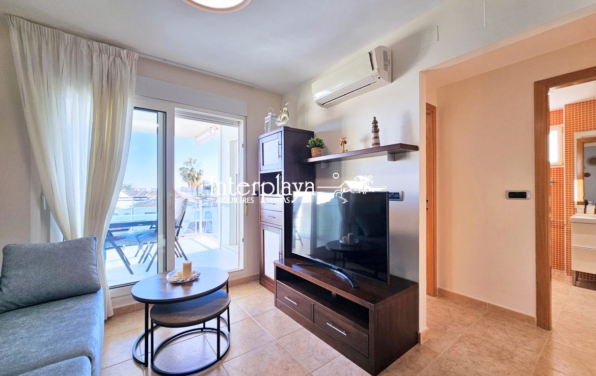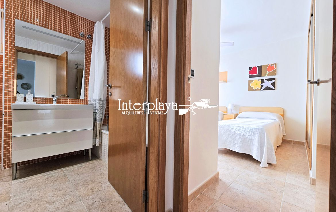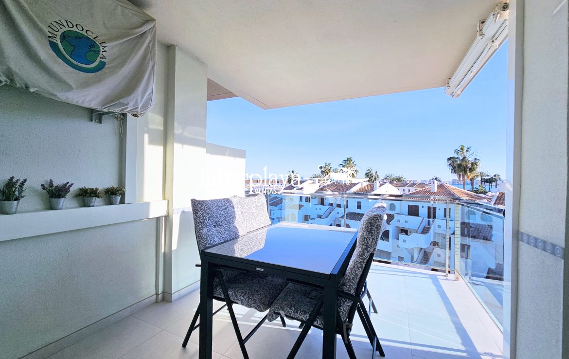 El piso cuenta con dos acogedores dormitorios, ambos equipados con armarios empotrados, y el dormitorio principal ofrece acceso directo a la terraza, perfecta para relajarse al atardecer. El salón comedor es coqueto y luminoso, también con acceso a la terraza y vistas al mar, creando un espacio ideal para disfrutar de momentos inolvidables. La cocina independiente está completamente equipada con electrodomésticos modernos y cuenta con un práctico lavadero.