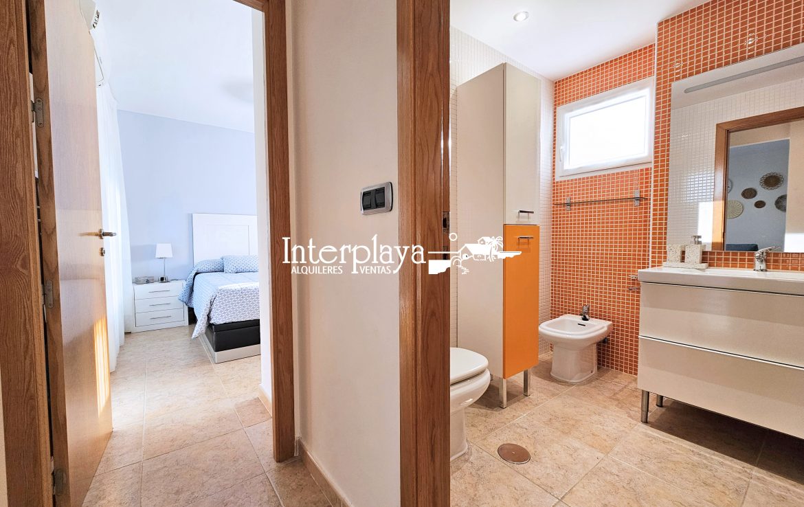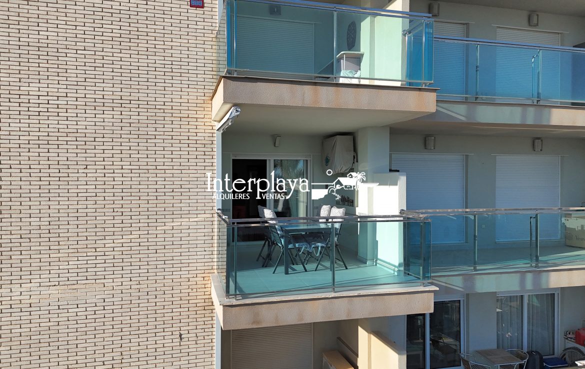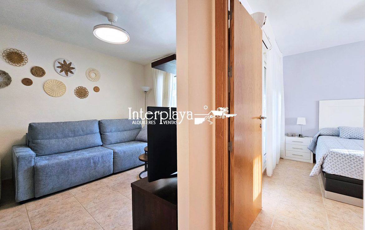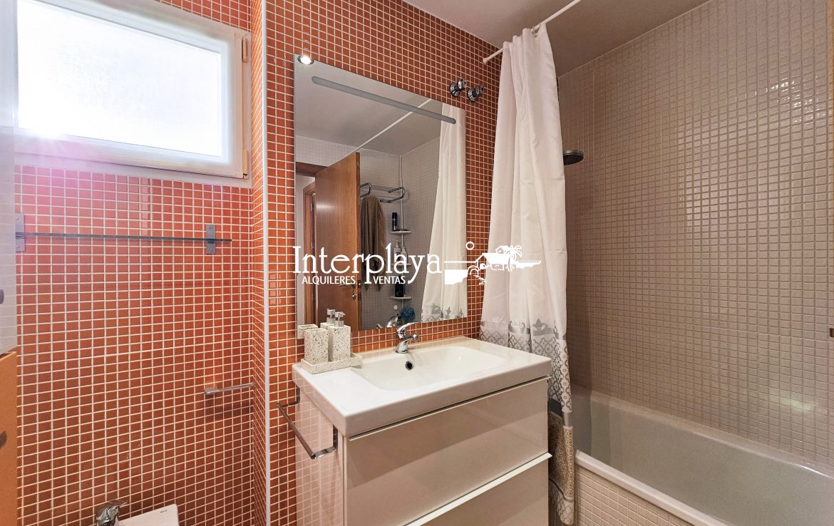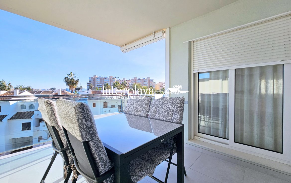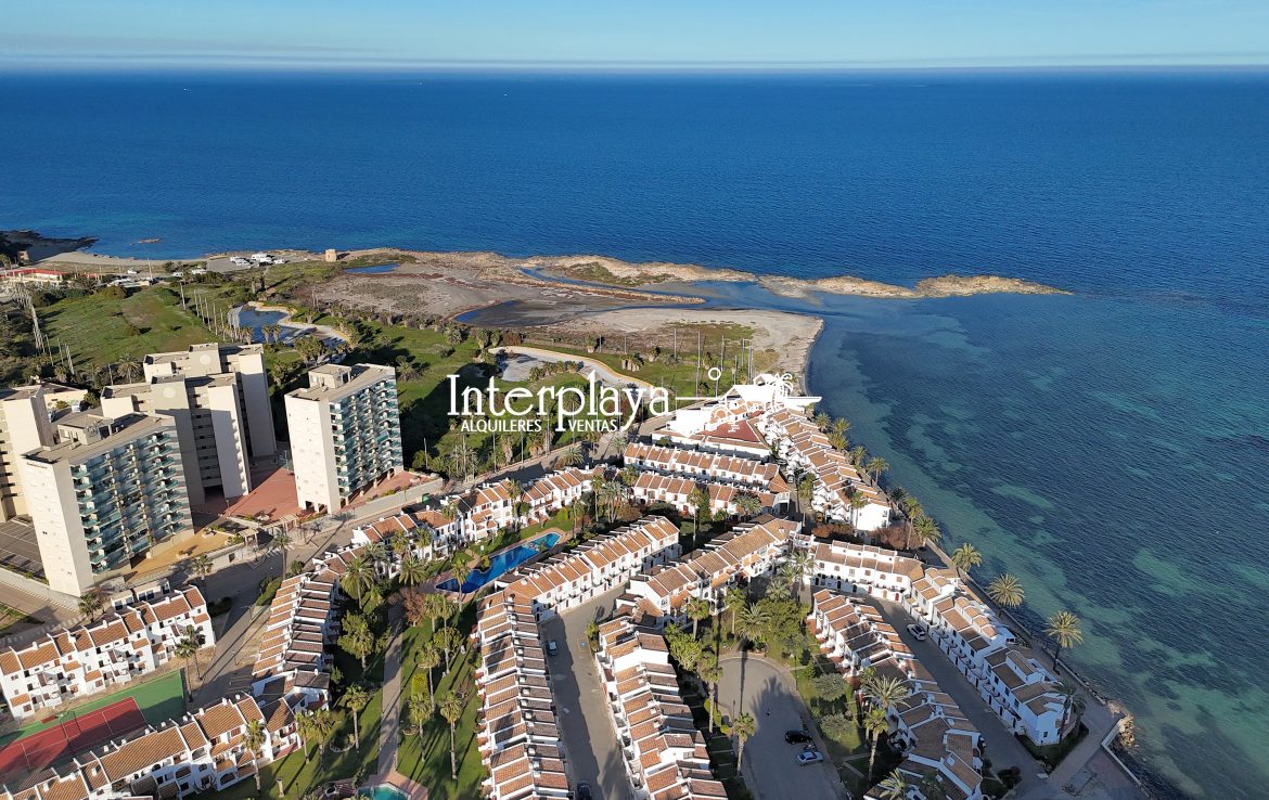 El piso cuenta con dos acogedores dormitorios, ambos equipados con armarios empotrados, y el dormitorio principal ofrece acceso directo a la terraza, perfecta para relajarse al atardecer. El salón comedor es coqueto y luminoso, también con acceso a la terraza y vistas al mar, creando un espacio ideal para disfrutar de momentos inolvidables. La cocina independiente está completamente equipada con electrodomésticos modernos y cuenta con un práctico lavadero.