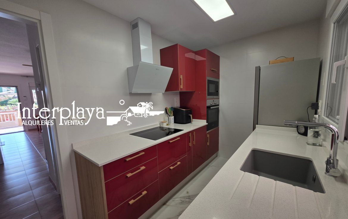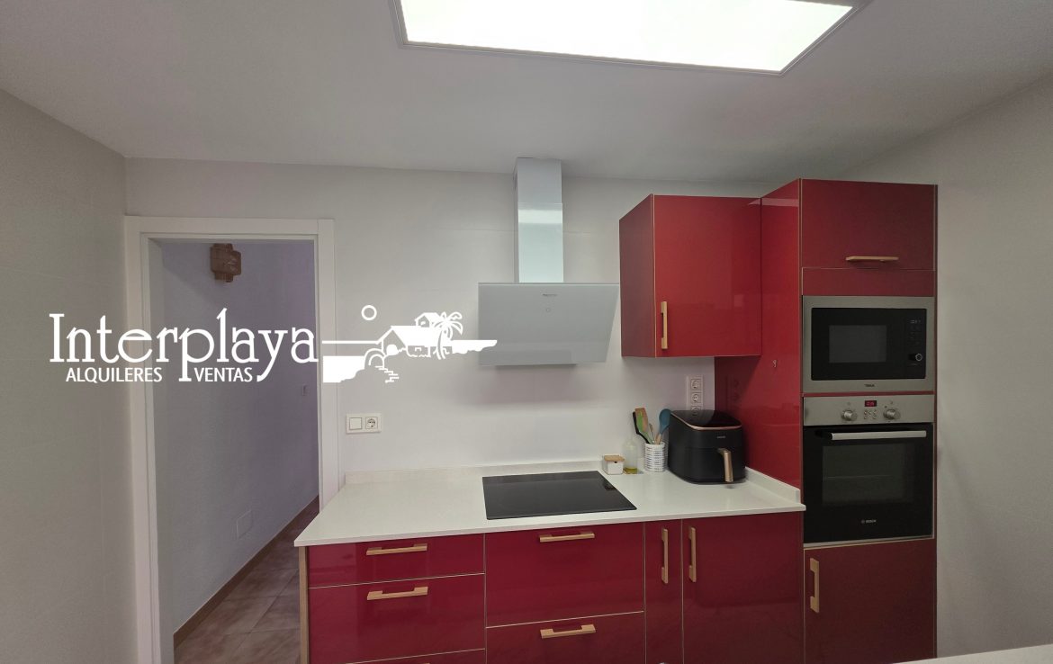 El amplio salón luminoso se convierte en el corazón de la casa, ideal para compartir momentos inolvidables con familiares y amigos. La cocina, totalmente equipada con muebles y electrodomésticos de calidad, hará que cada comida sea un placer, además, tiene un gran patio cerrado, desde el porche y la terraza brindan un acceso directo a la piscina soleada y a la playa, donde podrás relajarte bajo el sol durante todo el día.