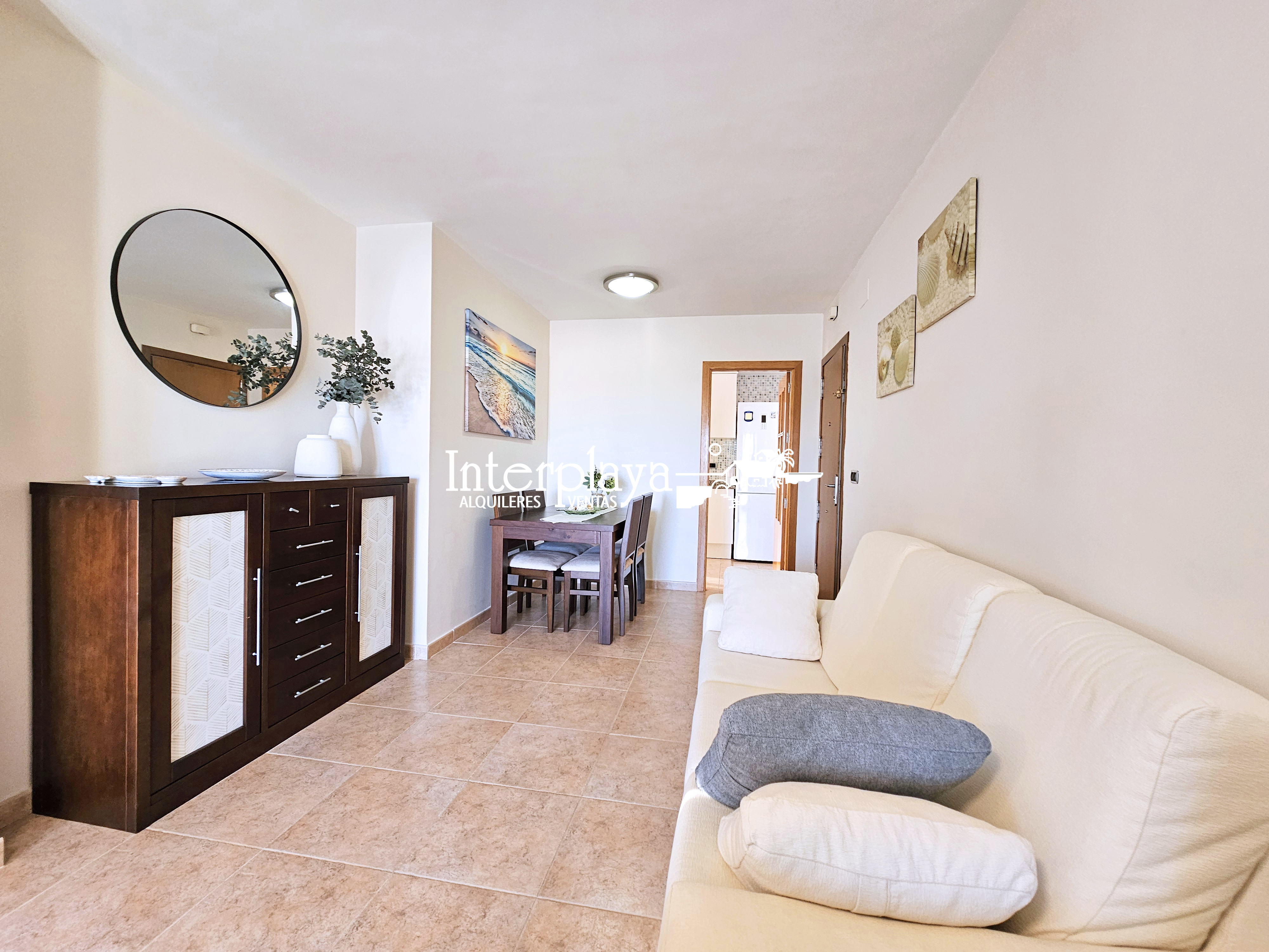 El piso cuenta con dos acogedores dormitorios, ambos equipados con armarios empotrados, y el dormitorio principal ofrece acceso directo a la terraza, perfecta para relajarse al atardecer. El salón comedor es coqueto y luminoso, también con acceso a la terraza y vistas al mar, creando un espacio ideal para disfrutar de momentos inolvidables. La cocina independiente está completamente equipada con electrodomésticos modernos y cuenta con un práctico lavadero.